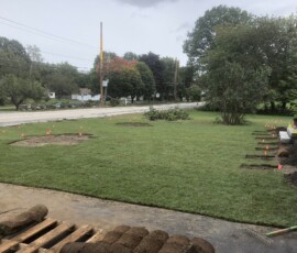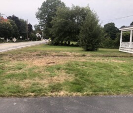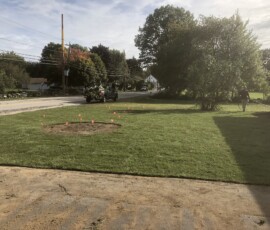 Before and After, a 2500 square foot lawn renovation with 10 foot tree rings for the later installation of maple trees and hostas in Rye, NH: