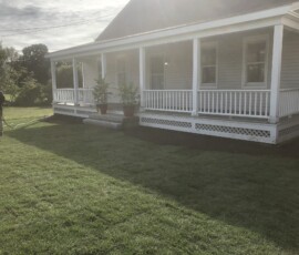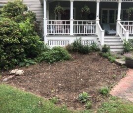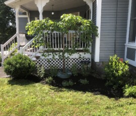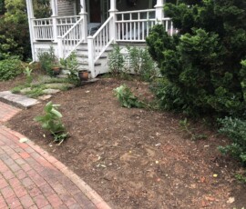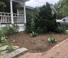Before and After. A project that included cleaning up the planting beds, significantly amending the soil, plant installation per our design, and mulching in Greenland, NH: