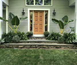 Decorated stone steps with potted ferns, elephant ear, and annual flowers in Rochester, NH: