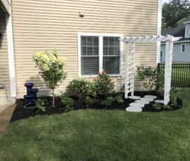 A small garden that we created with a fountain and trellis installed in Dover, NH: