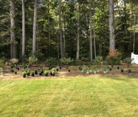 A large 30×50 planting area with mostly native plants in progress in Somersworth, NH. Ground covers are being planted in between the larger shrubs to decrease weed growth, and native wild flowers are being planted to attract pollinators:
