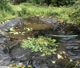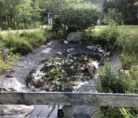 A very large pond in Durham, NH with two sections divided by a walking bridge being drained and cleaned. We also upgraded the ponds filtration and added a second pump: